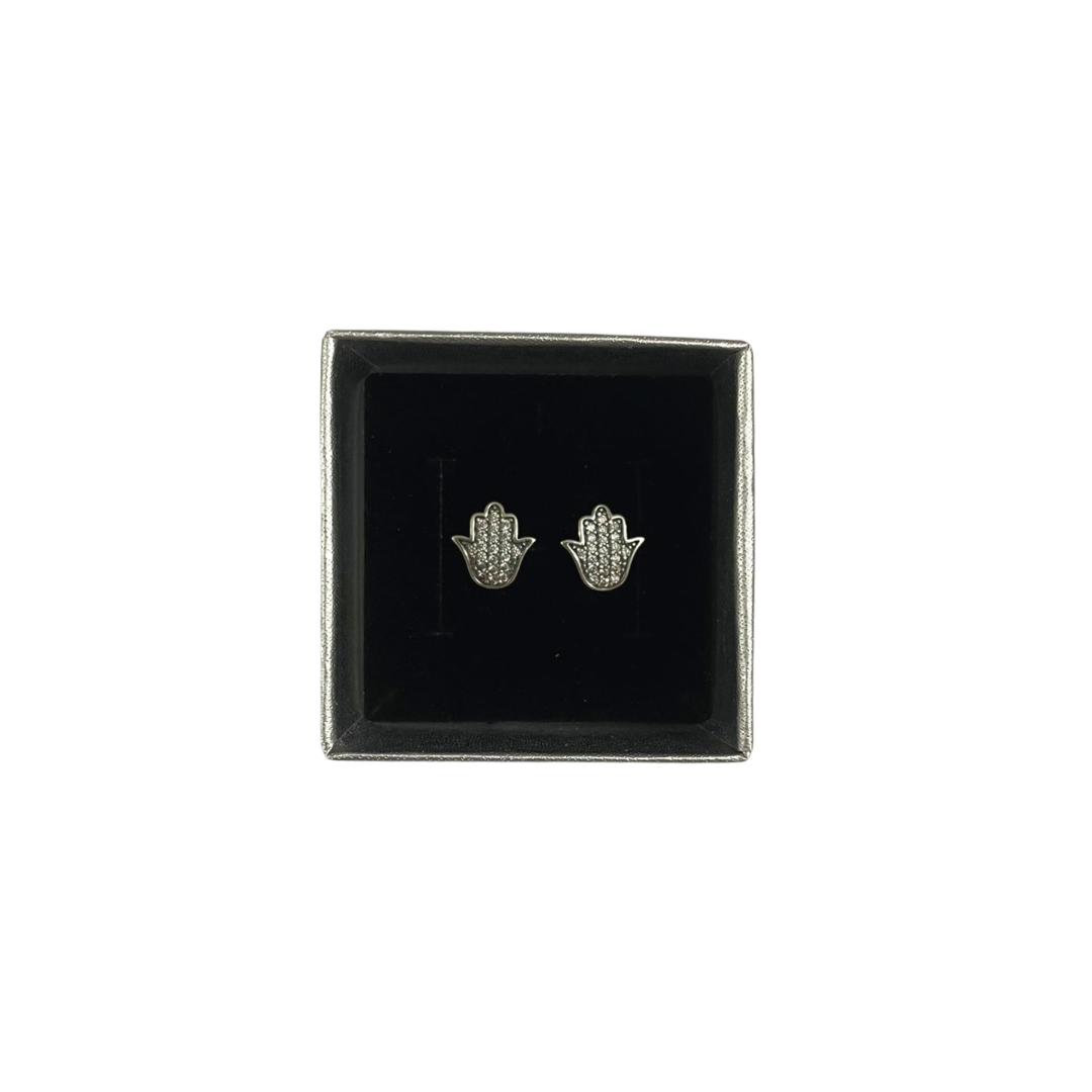 Brinco de hamsa, em prata 925 envelhecida, com pedras de zircônia cravejadas.