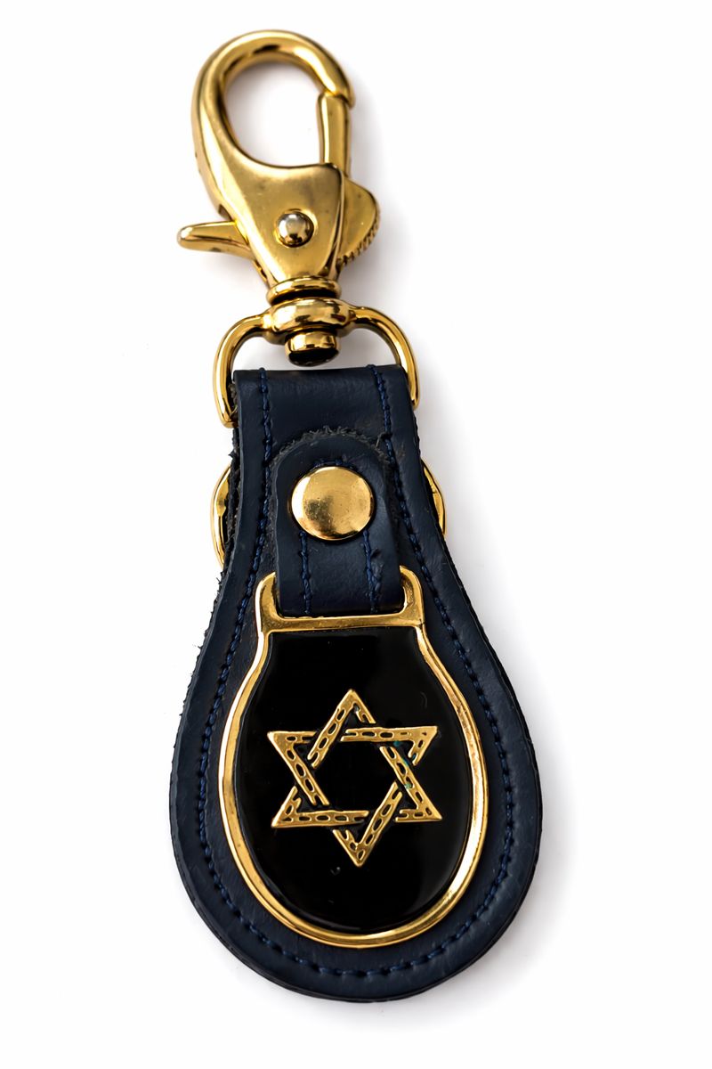 Chaveiro elegante e funcional, confeccionado em couro sintético de alta qualidade, com acabamento refinado e detalhes metálicos dourados. O destaque do design é a Estrela de David em relevo na parte frontal, símbolo tradicional do judaísmo que representa proteção, fé, identidade e conexão espiritual.