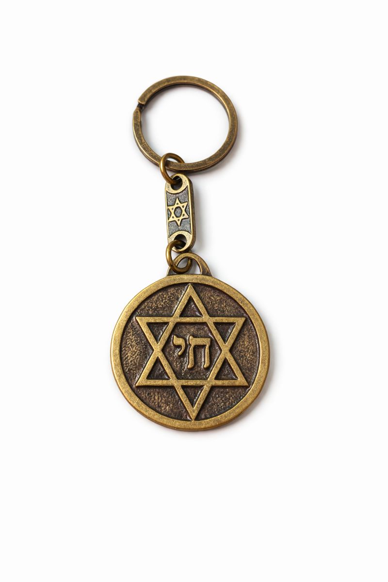 Este chaveiro redondo combina beleza, significado e tradição. Produzido em metal em ouro velho ou cobre de alta qualidade, traz em relevo a Estrela de Davi, símbolo milenar do povo de Israel, com o caractere hebraico “Chai” (חי) no centro, que representa “vida”.