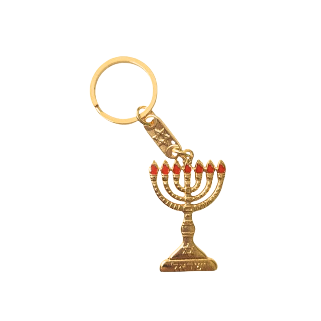 Chaveiro folheado a Ouro 18K, importado de Israel em forma de Menorá. O chaveiro apresenta Estrela de David e escrito "Israel", em hebraico, em sua base.