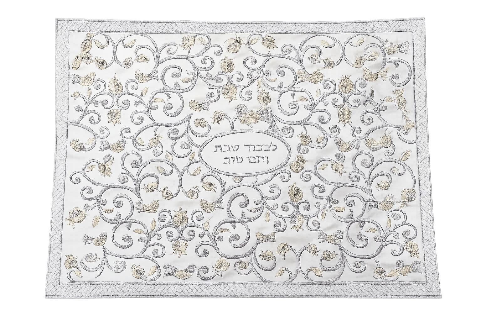 Confeccionada em tecido claro de alta qualidade, a cobertura apresenta bordados detalhados em tons prateados, com delicadas romãs espalhadas pelo desenho. A romã é um símbolo tradicional de abundância, prosperidade e mitzvot, tornando esta peça ainda mais especial para momentos sagrados em família.