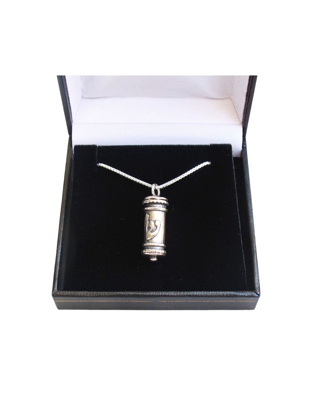 O design cilíndrico remete ao pergaminho da mezuzá, tornando a peça um forte símbolo de identidade judaica e espiritualidade. Acompanha corrente delicada, ideal para uso diário ou como presente significativo.