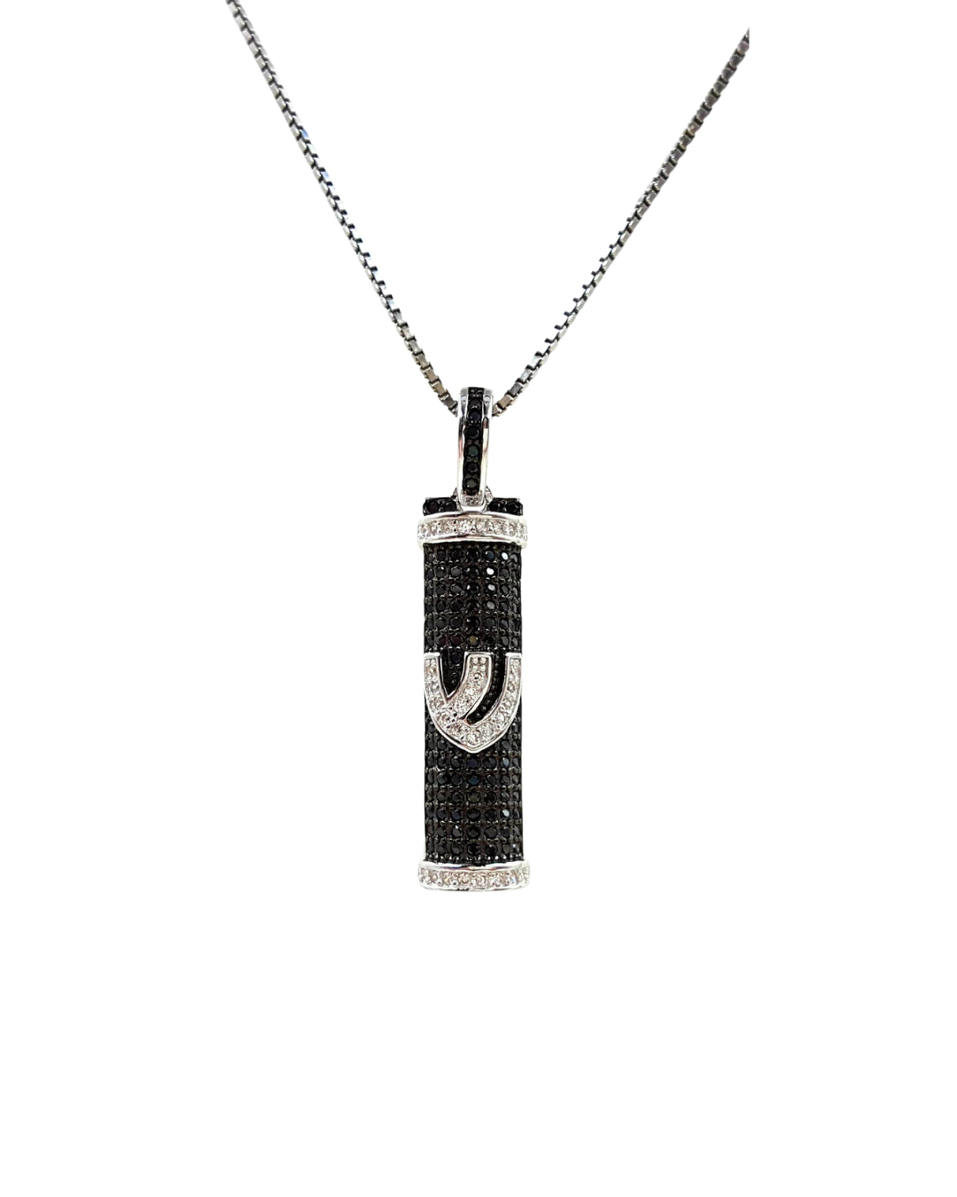 Este colar em formato de Mezuzá é uma joia judaica sofisticada e cheia de significado. O pingente apresenta acabamento escurecido texturizado, trazendo ao centro o Shin, assim como na Mezuzá, representando um dos nomes Divinos.