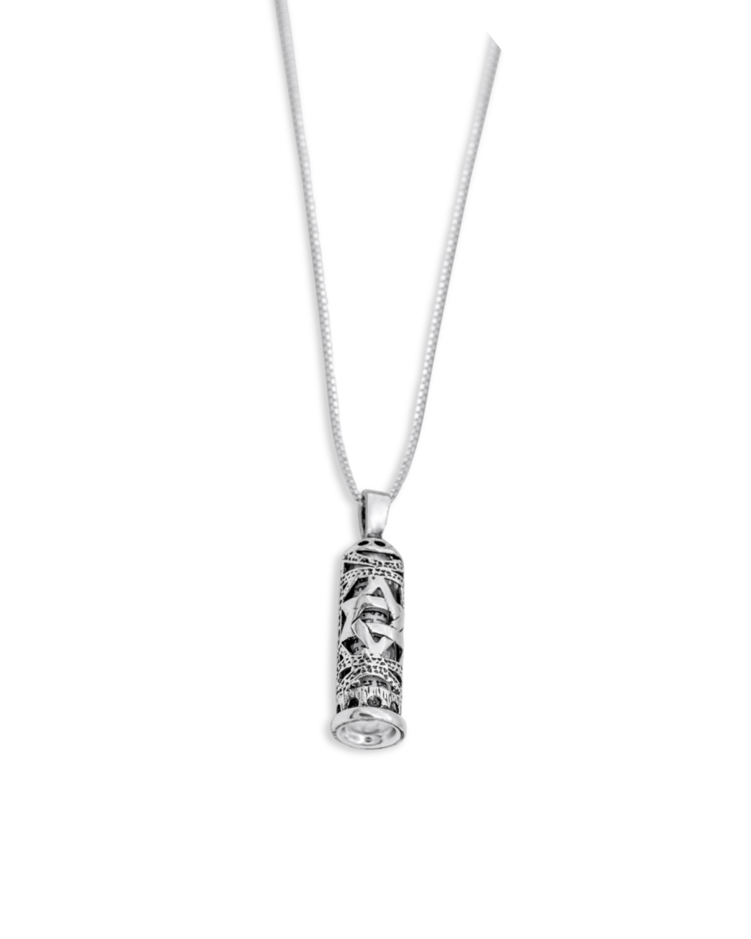 Colar Mezuzá confeccionado em prata, com design tradicional e acabamento detalhado, trazendo no centro do pingente a Estrela de David (Magen David), símbolo de proteção, fé e identidade judaica.