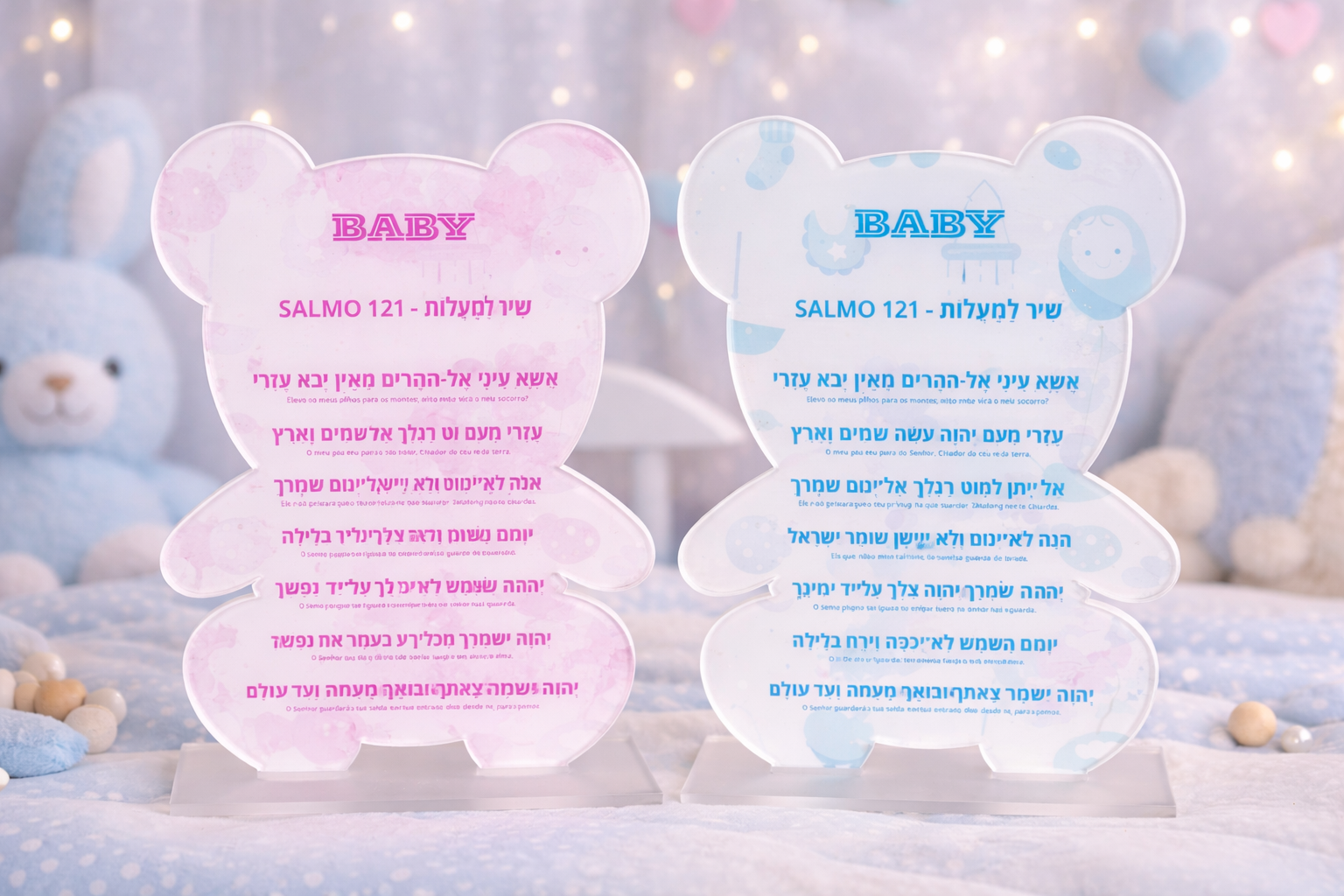 Produzido em acrílico de alta qualidade, o enfeite apresenta o Salmo 121 em hebraico e português, trazendo uma mensagem de fé, cuidado e proteção divina desde os primeiros momentos de vida. Seu design em formato de ursinho transmite suavidade e aconchego, harmonizando perfeitamente com ambientes infantis.