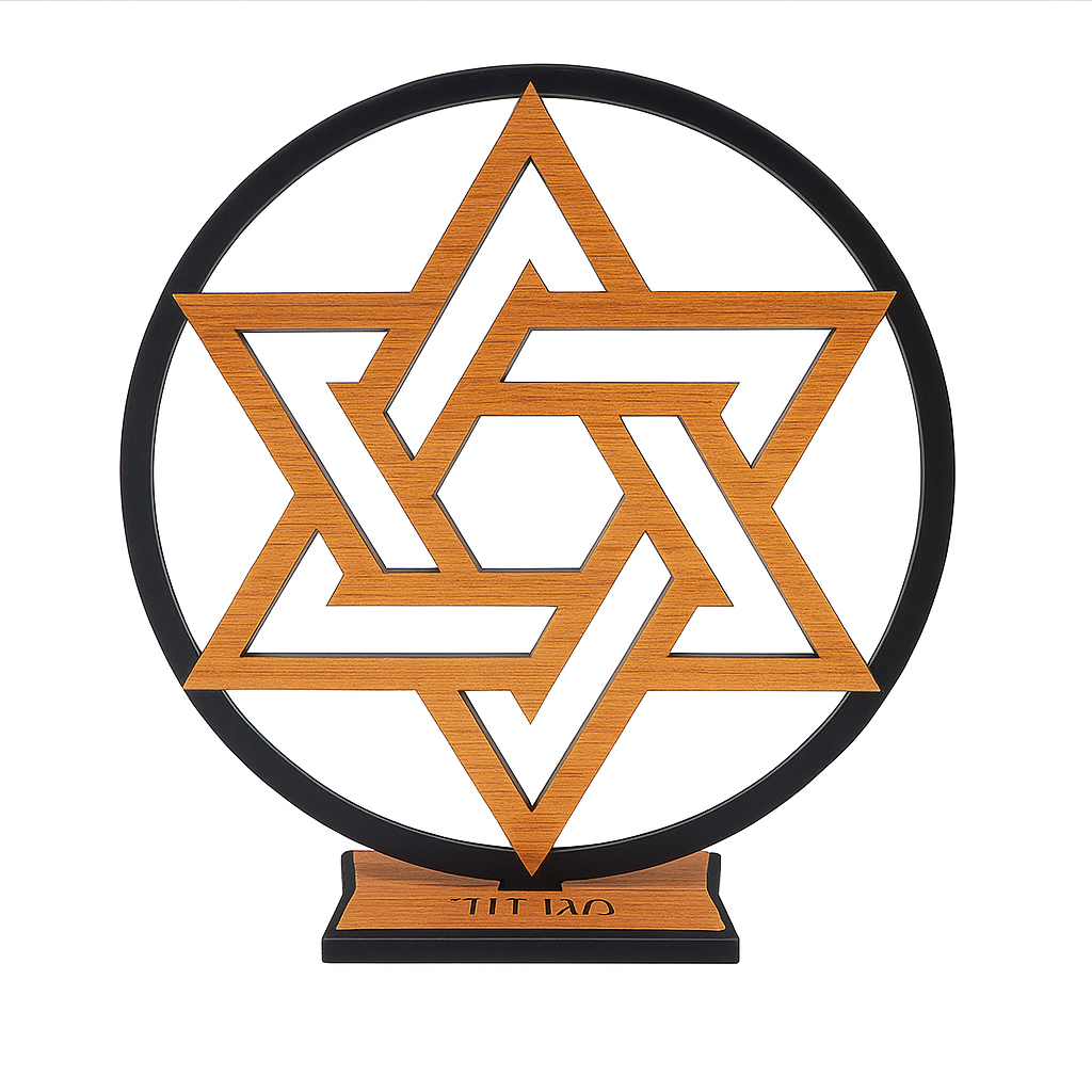 Com acabamento refinado em tons de madeira e preto, o enfeite é perfeito para decorar salas, escritórios, sinagogas ou espaços de reflexão, trazendo um toque cultural e simbólico ao ambiente.