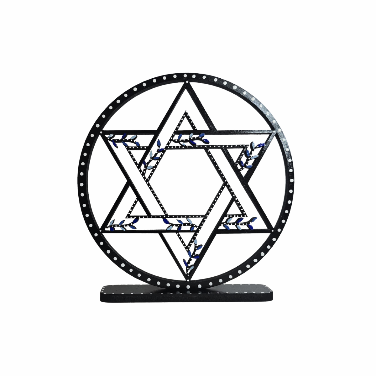 Uma peça elegante, simbólica e feita artesanalmente para decorar com significado. Esta Estrela de Davi de mesa é confeccionada em MDF de alta qualidade, com pintura à mão em tons delicados e acabamento em círculo com detalhes pontilhados.