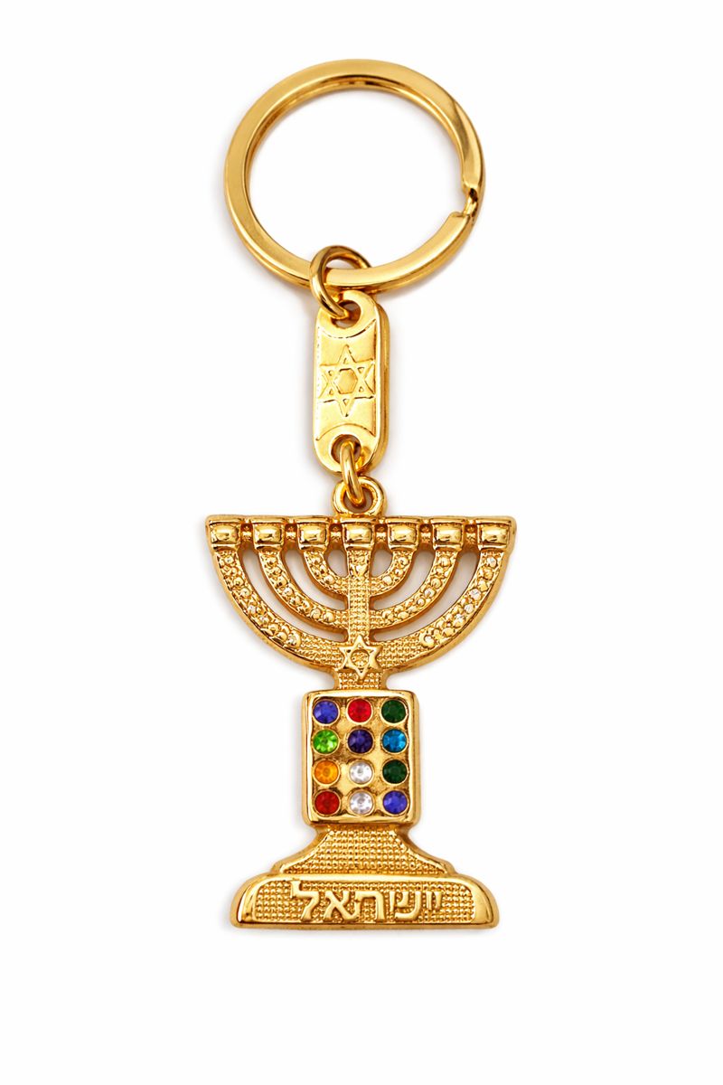 Chaveiro folheado a Ouro 18K, importado de Israel em forma de Menorá. O chaveiro apresenta as doze tibos de Israel e escrito "Israel", em hebraico, em sua base.