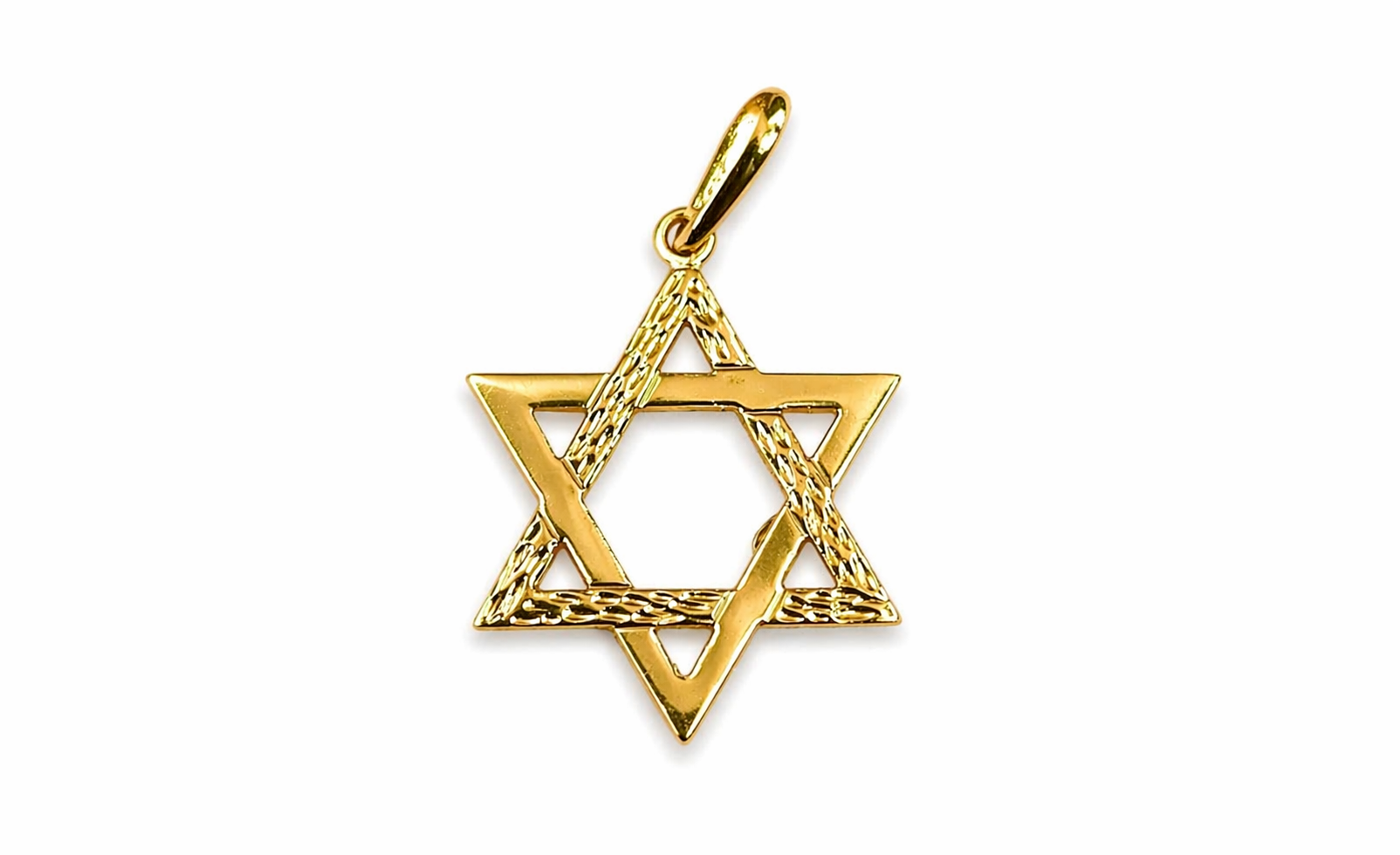 Este pingente apresenta a tradicional Estrela de David em uma versão elegante e diferenciada, com design trabalhado que valoriza cada detalhe da peça. Sua estrutura é formada por linhas entrelaçadas que criam um efeito visual sofisticado, combinando áreas lisas com partes texturizadas que refletem a luz de maneira sutil e refinada.