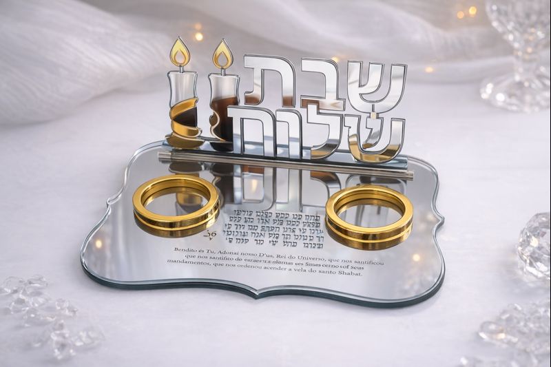 A base espelhada conta com a bênção do acendimento das velas gravada em hebraico e em português, permitindo uma experiência completa e acessível, unindo tradição e compreensão do ritual. O acabamento refletivo valoriza a luz das velas e confere um visual refinado à mesa.