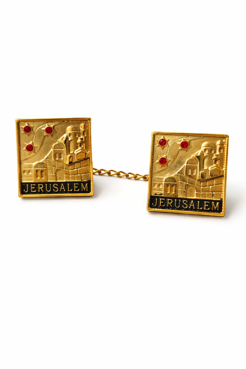 Este elegante prendedor de talit é confeccionado em metal com acabamento dourado e apresenta, em cada extremidade, uma plaquinha decorativa com relevo inspirado na cidade de Jerusalém. O design traz detalhes arquitetônicos clássicos, com a inscrição “Jerusalem” na parte frontal, conferindo um forte significado simbólico e espiritual à peça.