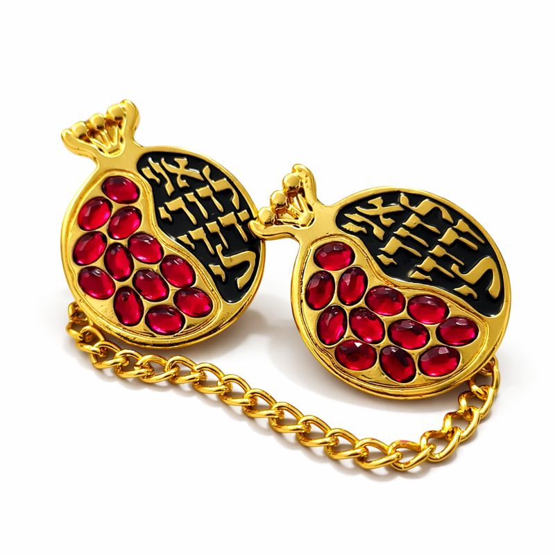 Prendedor de talit elegante e simbólico, confeccionado em metal com acabamento dourado, inspirado na romã, um dos símbolos mais tradicionais do judaísmo, associado à abundância, fertilidade e às mitsvot. Cada extremidade apresenta uma romã detalhada, decorada com pedras em tom rubi que remetem às sementes do fruto, além da inscrição em hebraico “Ani Ledodi VeDodi Li” – “Eu sou do meu amado e o meu amado é meu” (Cântico dos Cânticos 6:3), uma frase profundamente ligada ao amor, à união e à espiritualidade.