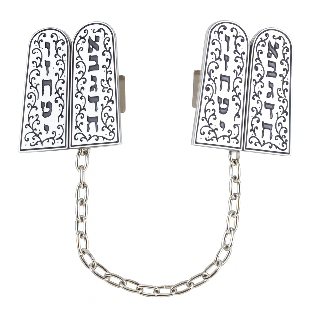 Inspirado nas Tábuas da Lei, este prendedor representa fé e tradição, sendo também uma bela peça de adorno judaico. Possui corrente metálica resistente, que une as duas partes, garantindo firmeza e elegância no uso.