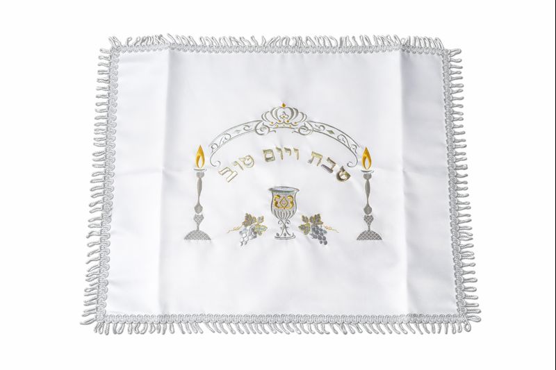 A base de cetim deste pano traz uma textura suave e luxuosa, combinando conforto com sofisticação. Sua cor branca irradia pureza e paz, evocando a atmosfera sagrada do Shabat e dos dias festivos.